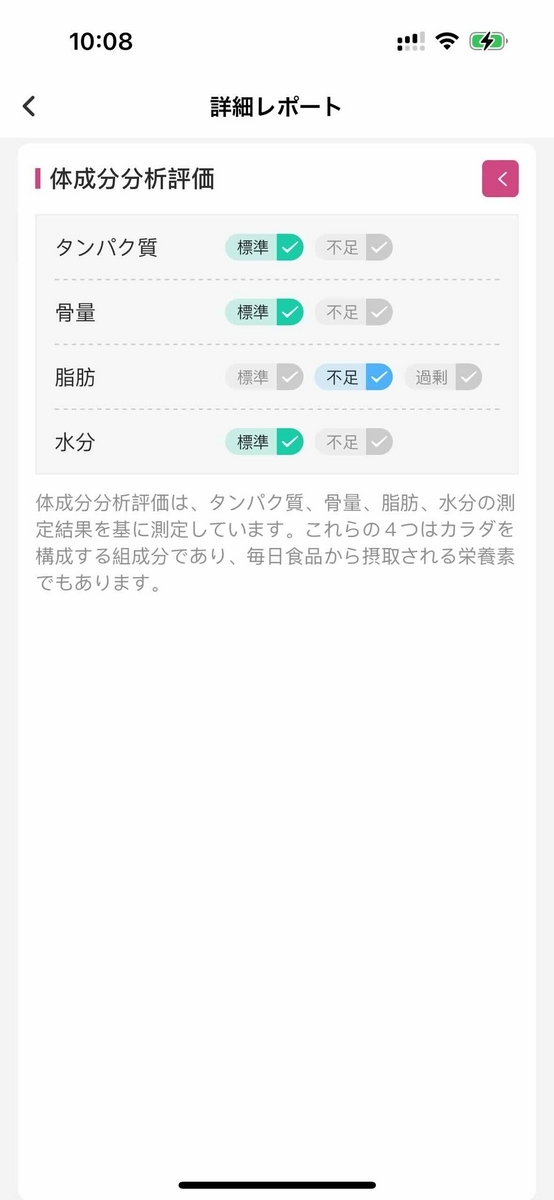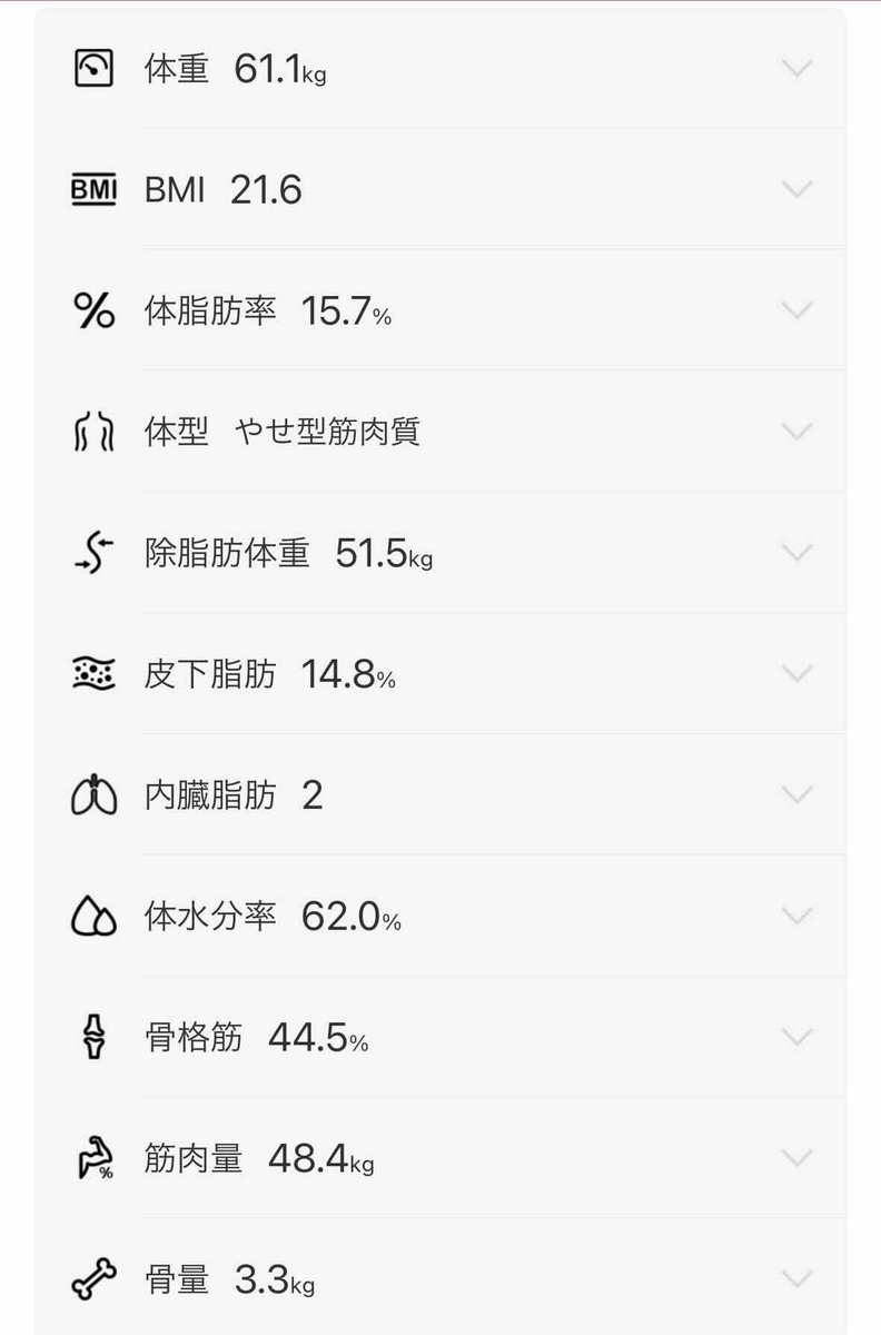 そして、新しい体重計は更に詳細な測定結果なんてものまであって「体成分分析」もしてくれる。